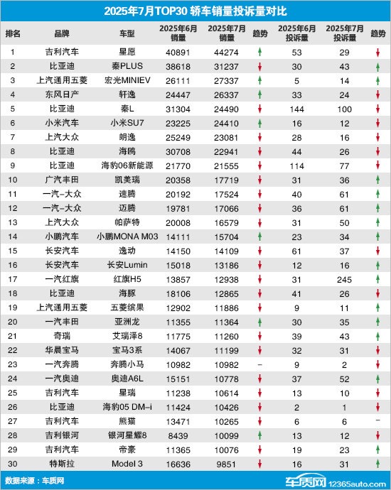 创牛配资 2025年7月TOP30轿车销量投诉量对应点评